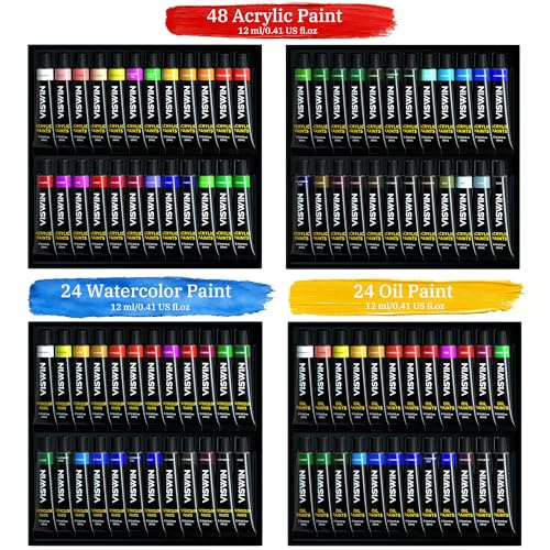 ALL-IN-ONE PROFESSIONAL PAINTING KIT: Our deluxe paint kit has everything you need: 2 premiun easels (Beechwood french & Adjustable aluminum with bag), 96 artist-quality paint (48 Acrylics, 24 Oils, 24 Watercolors), 30 premium brushes , versatile surfaces (Canvas Panels, Stretched Canvases, 3 Paper Pads), comprehensive art supplies (Palette Knives, Wood & Plastic Palettes & More). Ideal for adults, beginners, students, and artists exploring multiple mediums.